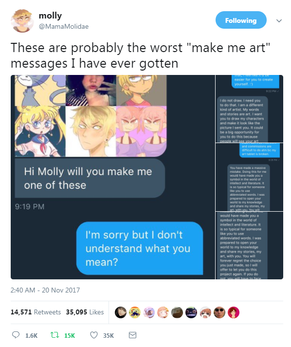 AKA ‘Free art copypasta‘ its from a DM someone sent to an artist on Twitter for refusing to do a collage for free.