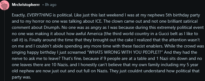 Exactly, EVERYTHING is political. Like just this last weekend I was at my nephews 5th birthday party and to my horror no one was talking about ICE. The clown came out and not one brilliant satirical comment about Drumph. No one was as angry as I was because during this extremely political event no one was making it about how awful America (the third world country in a Gucci belt as I like to call it) is. Finally around the time that they brought out the cake I realized that the attention wasn’t on me and I couldn’t abide spending any more time with these fascist enablers. While the crowd was singing happy birthday I just screamed “WHATS WRONG WITH YOU PEOPLE??” And they had the nerve to ask me to leave? That’s fine, because if 9 people are at a table and 1 Nazi sits down and no one leaves there are 10 Nazis, and I honestly can’t believe that my own family including my 5 year old nephew are now just out and out full on Nazis. They just couldnt understand how political that party was.