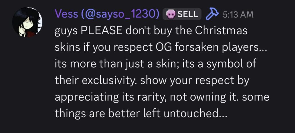 guys PLEASE don't buy the Christmas skins if you respect OG forsaken players... its more than just a skin; its a symbol of their exclusivity. show your respect by appreciating its rarity, not owning it. some things are better left untouched...