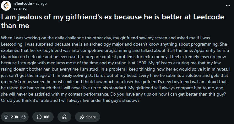 I am jealous of my girlfriend’s ex because he is better at Leetcode than me