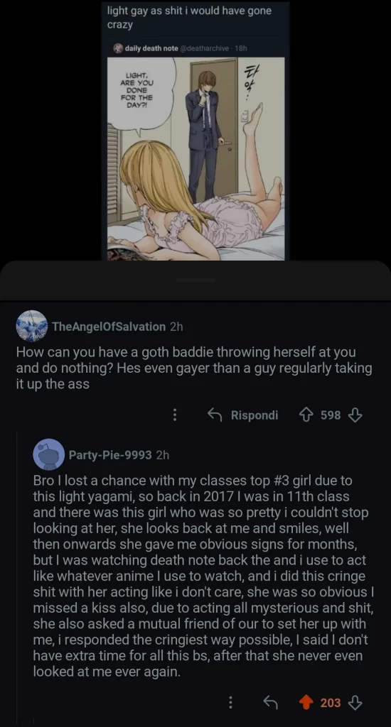 Bro I lost a chance with my classes top #3 girl due to this light yagami, so back in 2017 I was in 11th class and there was this girl who was so pretty i couldn't stop looking at her, she looks back at me and smiles, well then onwards she gave me obvious signs for months, but I was watching death note back the and i use to act like whatever anime I use to watch, and i did this cringe shit with her acting like i don't care, she was so obvious I missed a kiss also, due to acting all mysterious and shit, she also asked a mutual friend of our to set her up with me, i responded the cringiest way possible, I said I don't have extra time for all this bs, after that she never even looked at me ever again.