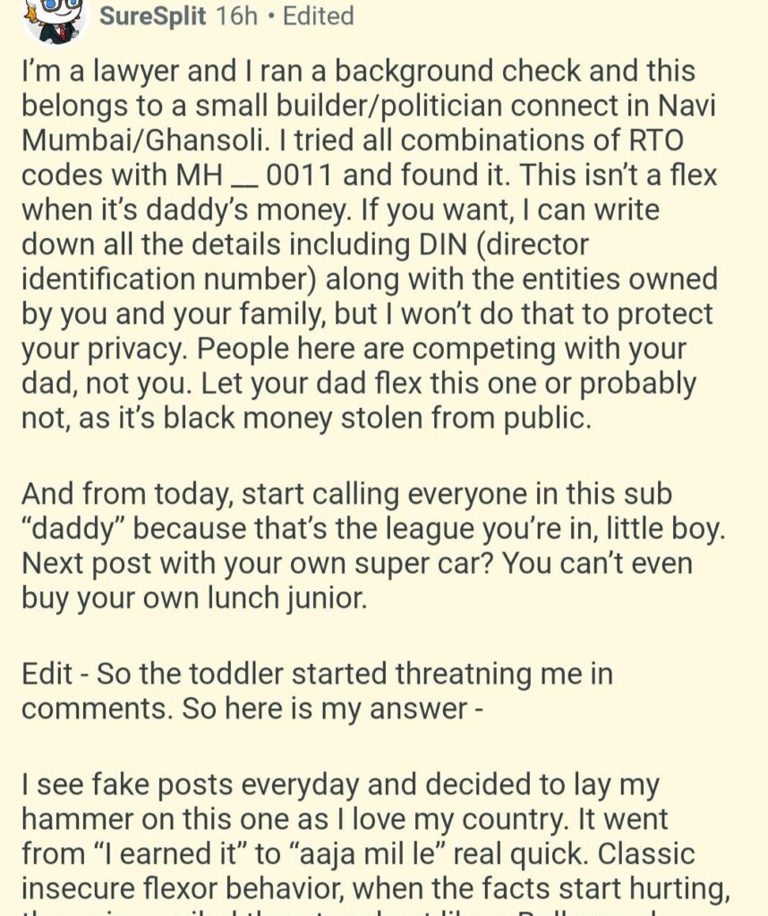 I'm a lawyer and I ran a background check and this belongs to a small builder/politician connect in Navi Mumbai/Ghansoli. I tried all combinations of RTO codes with MH_0001 and found it. This isn't a flex when it's daddy's money. If you want, I can write down all the details including DIN (director identification number) along with the entities owned by you and your family, but I won't do that to protect your privacy. People here are competing with your dad, not you. Let your dad flex this one or probably not, as it's black money stolen from public.