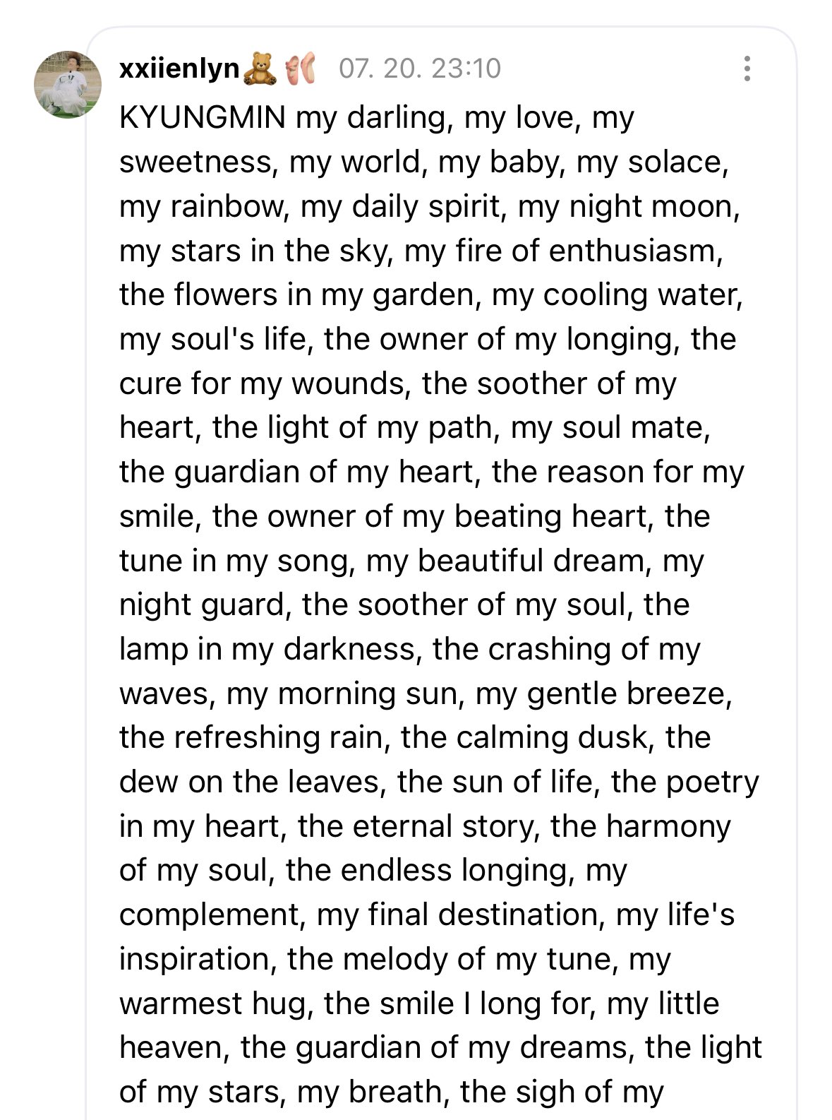 Its a schizo appreciation copypasta that began from the Kpop community on their favorite idol.