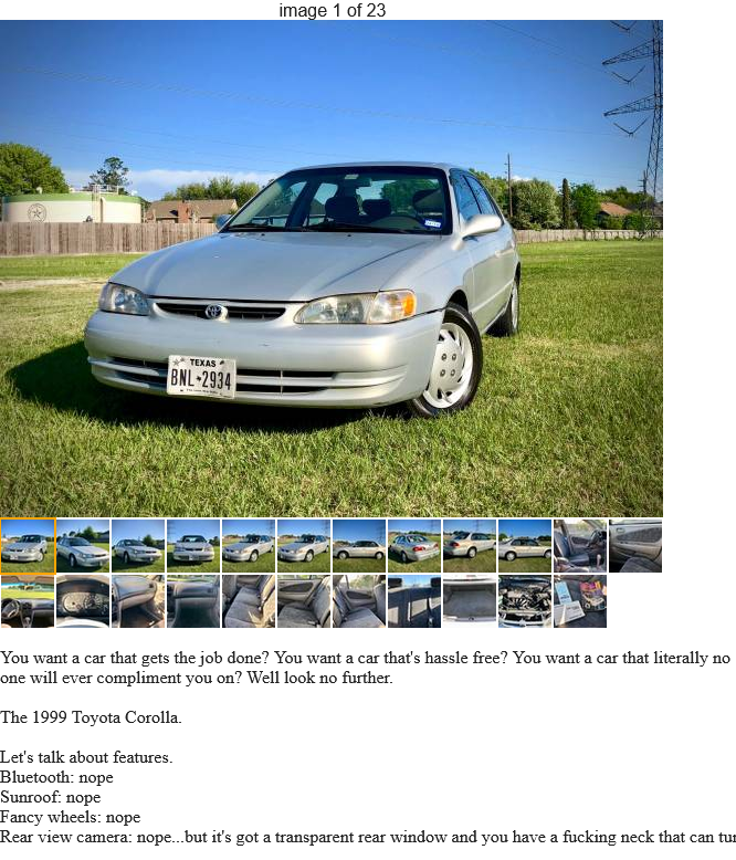Originated from a Craiglist ad for a 1999 Toyota Corolla back in 2018. People shared how funny it was and it became known as the Toyota Corolla copypasta. The original listing is gone but an archived version can still be found through Internet Archive.