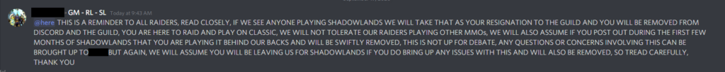 THIS IS A REMINDER TO ALL RAIDERS, READ CLOSELY, IF WE SEE ANYONE PLAYING SHADOWLANDS WE WILL TAKE THAT AS YOUR RESIGNATION TO THE GUILD AND YOU WILL BE REMOVED FROM DISCORD AND THE GUILD, YOU ARE HERE TO RAID AND PLAY ON CLASSIC, WE WILL NOT TOLERATE OUR RAIDERS PLAYING OTHER MMOS, WE WILL ALSO ASSUME IF YOU POST OUT DURING THE FIRST FEW MONTHS OF SHADOWLANDS THAT YOU ARE PLAYING IT BEHIND OUR BACKS AND WILL BE SWIFTLY REMOVED, THIS IS NOT UP FOR DEBATE, ANY QUESTIONS OR CONCERNS INVOLVING THIS CAN BE BROUGHT UP TO BUT AGAIN, WE WILL ASSUME YOU WILL BE LEAVING US FOR SHADOWLANDS IF YOU DO BRING UP ANY ISSUES WITH THIS AND WILL ALSO BE REMOVED, SO TREAD CAREFULLY, THANK YOU