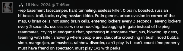 -rep basement facecamper, hard tunneling, useless killer, 0 brain, boosted, russian hitboxes, troll, toxic, crying russian kiddo, Putin genres, urban evasion in corner of the map, 0 brian cells, not using brain cells, entering lockers every 3 seconds, leaving lockers every 3 seconds, useless surv, no unhooking, teabagging in gate instead of helping teammates, crying in endgame chat, spamming in endgame chat, sus, blowing up gens, teaming with killer, showing where people are, claudette crouching in bush, noed bubba, simp, mangozjeb, animashnik, rainbow disorder, can't play 1v1, can't count time properly, must have friend on spectator, must play 1v1 with perks