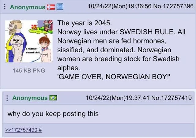 The year is 2045. Norway lives under SWEDISH RULE. All Norwegian men are fed hormones, sissified, and dominated. Norwegian women are breeding stock for Swedish alphas.