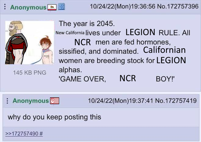 The year is 2045. New California lives under LEGION RULE. All NCR men are sissified, and dominated. Californian women are breeding stock for LEGION alphas.